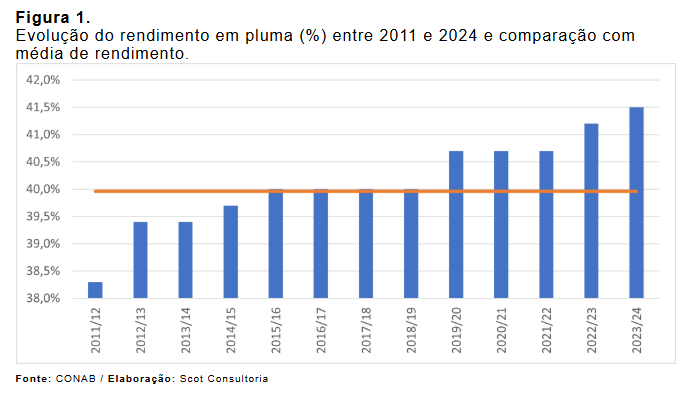 O rendimento industrial da pluma também apresenta evolução. A média dos últimos dez anos era de 40%. Em 2024, esse índice foi de 41,5%, um aumento de 3,61% frente a 2023. O coproduto caroço, que corresponde aos 58,5% restantes do algodão, teve uma produção de 8,9 milhões de toneladas em 2024, sendo destinado predominantemente para a nutrição de ruminantes.