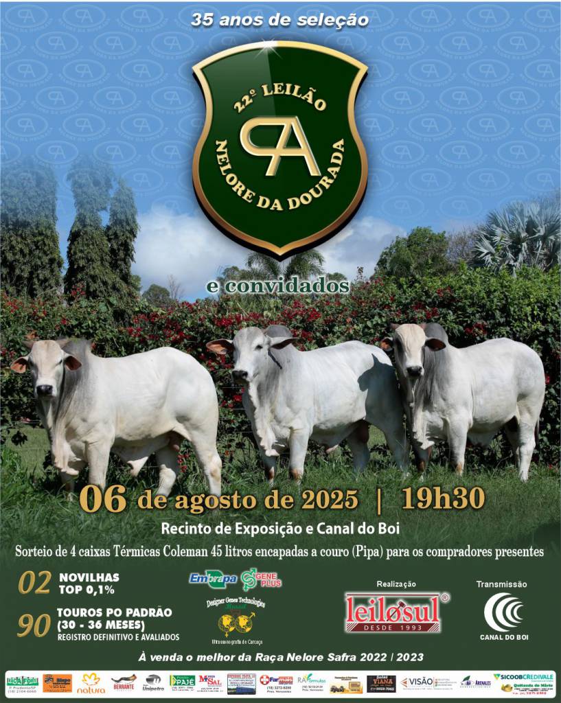 A Leilosul realiza nesta quarta-feira, dia 6 de agosto às 20h pelo Canal do Boi, o 22° Leilão Nelore da Dourada e Convidados. Oferta de 2 novilhas top 0,1% e 90 touros PO padrão (30 - 36 MESES) com registro definitivo e avaliados. O evento será realizado no Recinto de Exposição em Presidente Venceslau/SP.