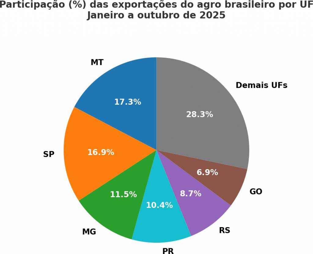 Figura 1: Participações das exportações do agro por UF, janeiro a outubro de 2025.