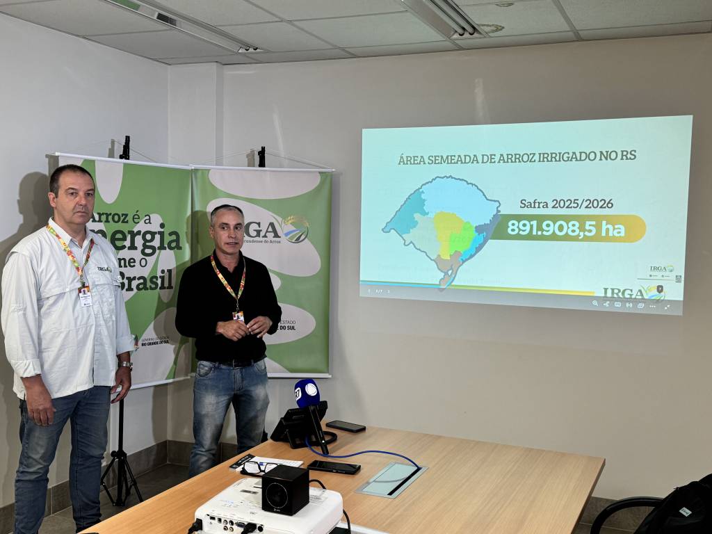 O Instituto Rio Grandense do Arroz (Irga) divulgou, nesta quinta-feira (12/2), a estimativa para a safra 2025/2026 de arroz no Rio Grande do Sul. Os dados foram apresentados durante encontro com a imprensa, na sede da autarquia, em Porto Alegre, pelo presidente do Irga, Alexandre Velho, e por técnicos do Instituto. A projeção aponta retração de 8,06% na área semeada em relação ao ciclo anterior. Na safra 2024/2025, o Estado registrou 970.194 hectares cultivados. Para 2025/2026, o plantio foi de 891.908,5 hectares.