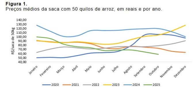 O preço médio por saca de 50kg, em outubro foi o menor desde abril de 2020, com a saca em R$58,03, queda de 51,3% em relação a outubro de 2024 (figura 1), segundo o Indicador do Arroz em casca Cepea/IRGA-RS.