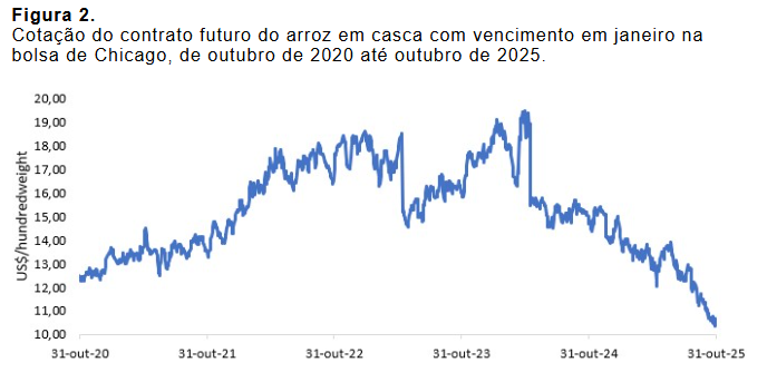Em outubro, os contratos futuros em Chicago para vencimento em janeiro caíram para os menores níveis em cinco anos, chegando a US$10,37 por hundredweight*, baixa de 31,2% em relação ao mesmo período de 2024 (figura 2).