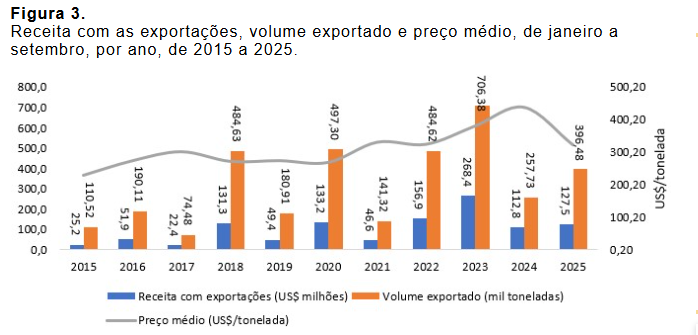 Embora a exportação tenha aumentado em 2025 frente a 2024, os preços pressionados e pouca expressão em comparação com o mercado interno na definição das cotações, tornam improvável a recuperação das cotações.