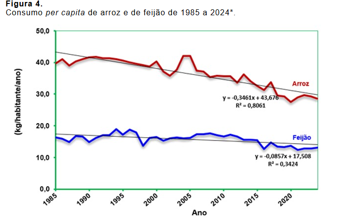 Um estudo da Embrapa Arroz e Feijão revela a perspectiva de redução do consumo de arroz. O consumo per capita passou de 48,69kg por habitante por ano em 1997 para 28,5kg por habitante por ano em 2024 (figura 4). Os principais fatores que explicam essa mudança foram urbanização e menos tempo para cozinhar, maior inserção feminina no mercado de trabalho, preço e renda relativos e a substituição por produtos prontos e ultraprocessados.