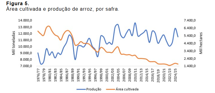 Com relação ao cenário internacional, a Índia afrouxou restrições e ampliou embarques desde o fim de 2024 e ao longo de 2025, ao remover o piso de preço do arroz branco não basmati (arroz de grão longo) e zerar o imposto de exportação do arroz parboilizado em outubro de 2024, e em março de 2025, liberar a exportação de arroz 100,0% quebrado.