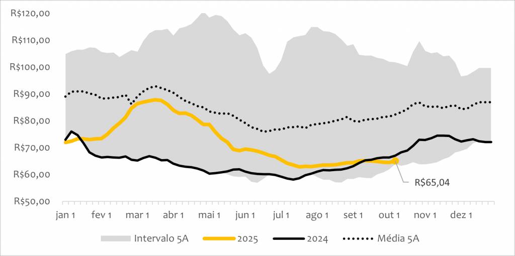 O último relatório do USDA foi o de setembro e, por conta do “shutdown” do governo norte-americano, novos dados da safra em colheita nos EUA pararam de chegar ao mercado. Entretanto, agentes do mercado por lá ressaltam que a produtividade está um pouco abaixo do último dado do USDA, mas que deve ser uma safra com uma produção muito boa e levemente abaixo da última estimativa.