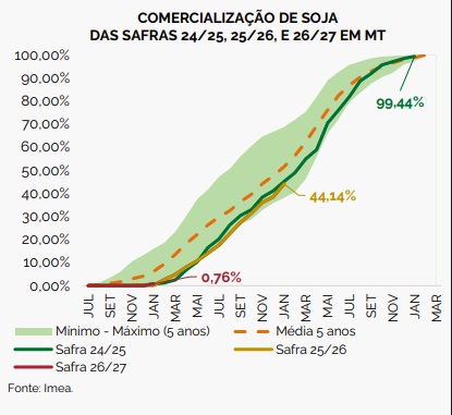 Em dez/25, as vendas de soja da safra 24/25 em MT alcançaram 99,44% da produção, avanço de 0,98 p.p. em relação a nov/25. As negociações estão 0,30 p.p. abaixo do registrado no ciclo anterior, reflexo do recuo mensal de 3,86% no preço da oleaginosa, que encerrou o período na média de R$ 116,46/sc.