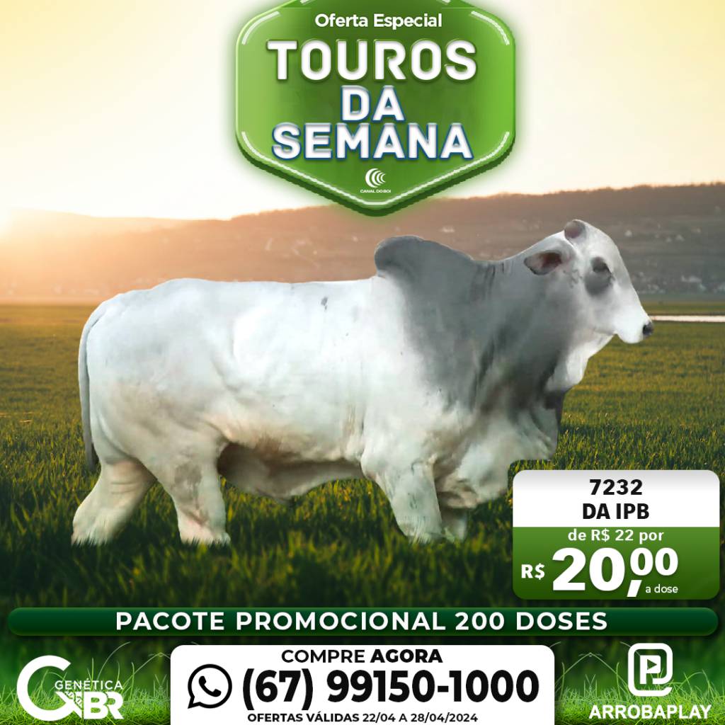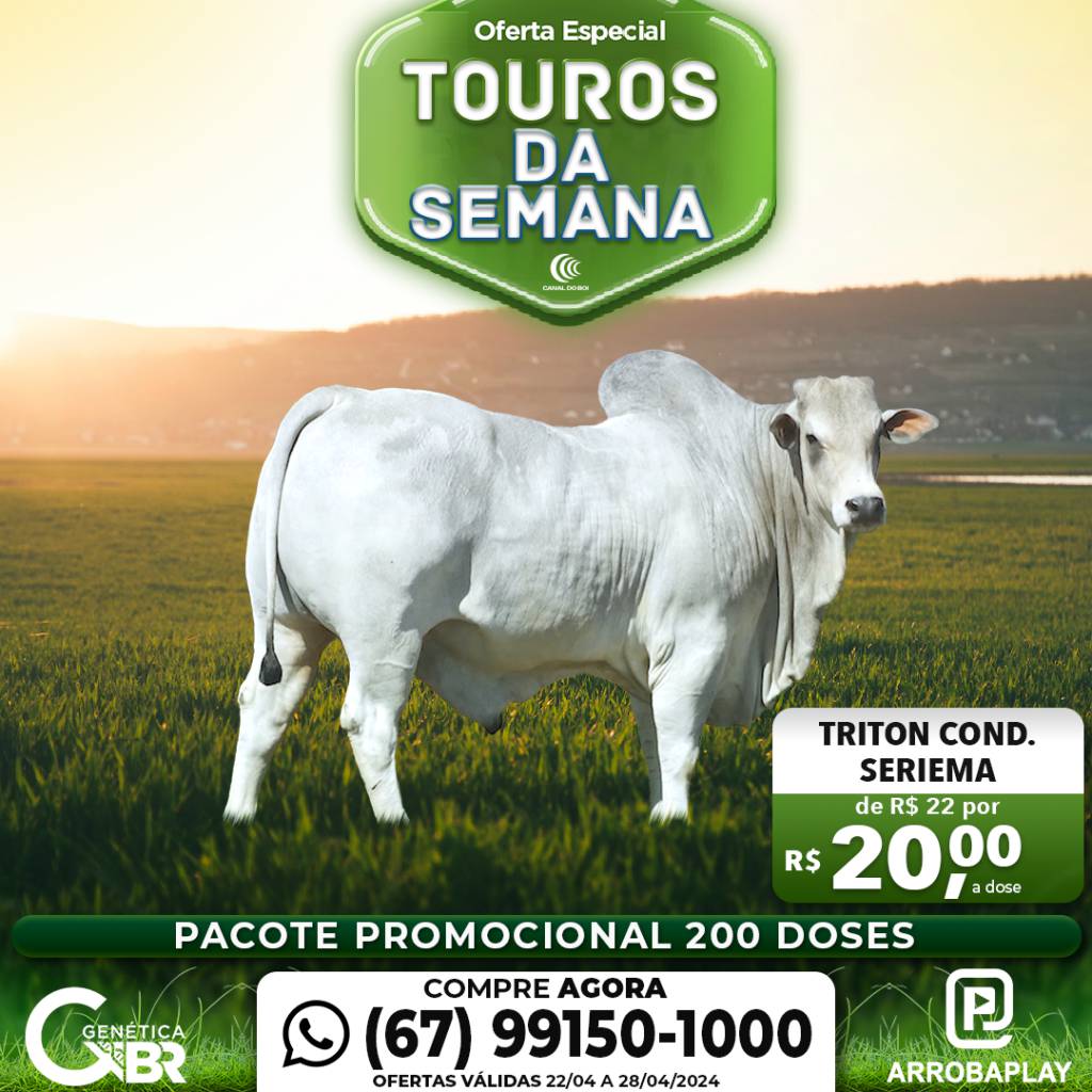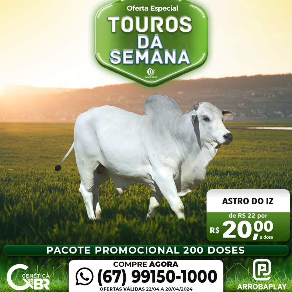 O programa "Genética BR" promove até domingo, dia 22 de março, a oferta especial "Touros da Semana". Serão 7 dias de material genético de touros líderes de sumários da Fazenda Pecuária BR a preços promocionais: R$ 20,00 a dose com o pacote mínimo de 200 e máximo de 100 doses por touro. Veja as ofertas:
