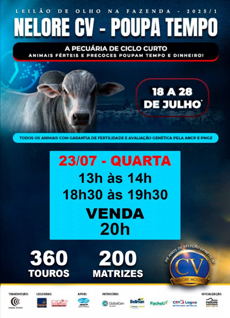 Hoje às 13h no Canal do Boi, dia 23 de julho você confere o Leilão De Olho Na Fazenda Nelore CV. Venda a preço fixo de touros e matrizes com garantia de fertilidade e avaliação genética pela ANCP e PMGZ. A realização é da Connect Leilões e Leilosul.