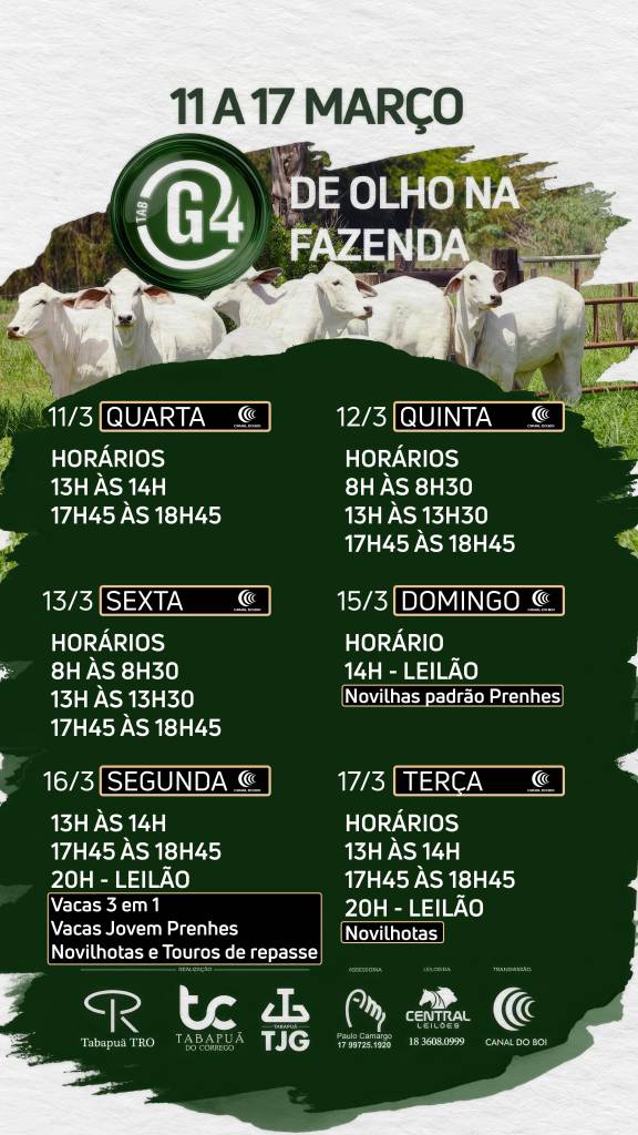 Começa nesta quarta-feira, dia 11 de março, no Canal do Boi, o De Olho na Fazenda TAB G4. Até o dia 17, você vai poder acompanhar a oferta de novilhas padrão prenhes, vacas 3 em 1, vacas jovens prenhes, novilhotas e touros de repasse que o grupo vai ofertar, direto da fazenda Porto Seguro em Nova Granada/SP.