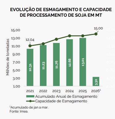 Em 2026, a capacidade de processamento das indústrias no estado totalizou 15 milhões de toneladas de soja, volume 3,20% superior ao registrado no ano anterior, segundo relatório do Imea, instituto Mato-grossense de economia agropecuária. Essa expansão reflete a demanda aquecida pelos coprodutos da soja, que vem apresentando crescimento desde o início do ano. Como resultado, em mar/26, as indústrias esmagadoras do estado processaram 1,23 milhão de toneladas, volume 10,79% superior ao registrado em fev/26 e o maior já observado para o mês em toda a série histórica.