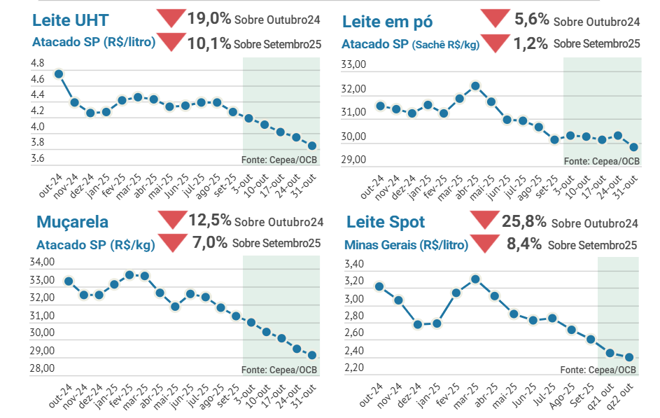 Os preços dos derivados lácteos no atacado em outubro seguiram a tendência de baixa dos últimos meses, com alta oferta e demanda limitada. A importação de leite e derivados continua elevada, com outubro fechando em 208 milhões de litros equivalente, o maior volume desde fevereiro/25. O cenário internacional colabora para a queda dos preços internos, uma vez que o índice de preços do GDT segue recuando. No mercado de leite Spot a baixa demanda continua pressionando os preços, enquanto a produção de leite cresce no campo. Para os derivados, as negociações com os varejistas ficaram mais difíceis em um momento de alto estoque e preços recuando a cada semana. Isso acaba diminuindo o poder de negociação da indústria, forçando mais quedas nos preços.