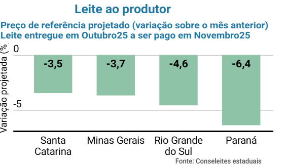 As sinalizações do Conseleite para o leite entregue em outubro foram de fortes variações negativas. Em todos os estados, as quedas foram por volta de dez centavos em relação ao mês anterior. Paraná apresentou a queda mais expressiva, -6,4% e Santa Catarina a menor -3,5%.