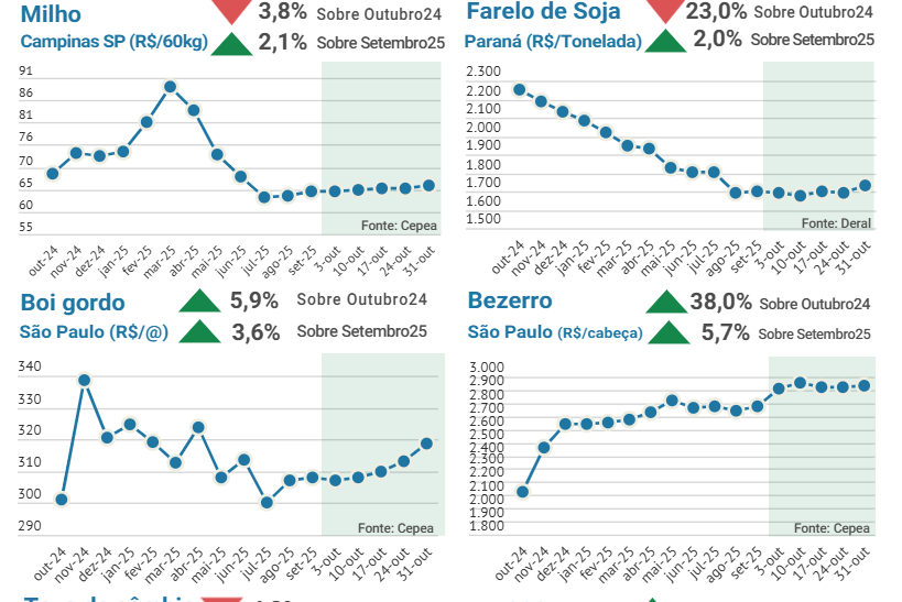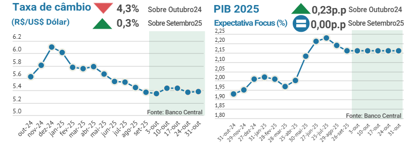 Os mercados de milho e soja registraram leves altas no último mês, apesar dos bons estoques e perspectivas favoráveis para a safra. No caso da soja, as negociações entre EUA e China, que sinalizaram um retorno chinês para compra de soja norte-americana, acabou puxando as cotações em Chicago e isso refletiu no mercado brasileiro. Além disso, o atraso nas precipitações e no plantio em algumas regiões também pressionou as cotações da oleaginosa e do milho. No mercado pecuário, a oferta restrita e boa demanda para exportação acabaram valorizando o preço do boi e do bezerro. O PIB segue com previsões piores que nos últimos anos para o crescimento em 2025.