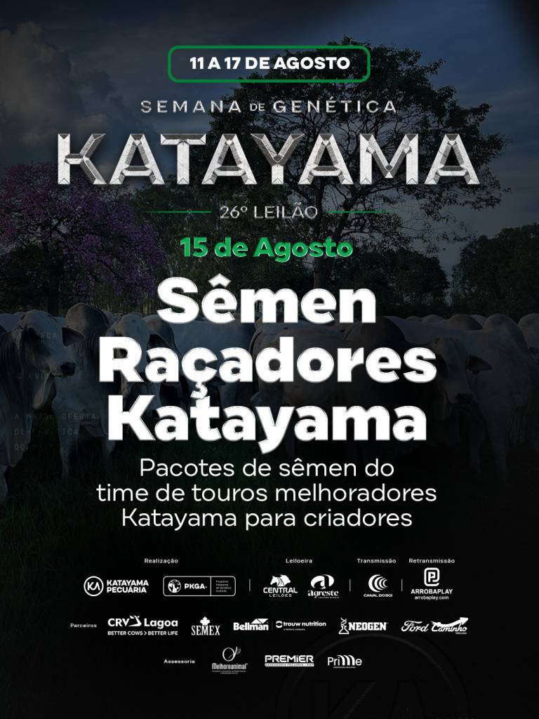 A Central Leilões realiza nesta sexta-feira, dia 15 agosto às 19h pelo Canal do Boi, durante a 26ª Semana De Genética Katayama, o Leilão Sêmen Raçadores Katayama. Oferta de pacotes de sêmen do time de touros melhoradores katayama para criadores. O evento será realizado em Guararapes/SP.