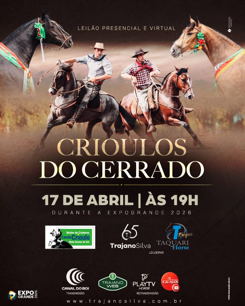 Nesta sexta-feira, dia 17 de abril às 20h no Canal do Boi, você confere o Leilão Crioulos do Cerrado. Uma oferta selecionada de cavalos, éguas e sêmen com a realização da Trajano Silva Leilões e Taquari Leilões.