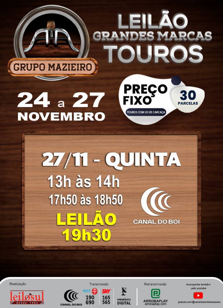 Nesta quinta-feira, dia 27 de novembro, você confere o encerramento do Leilão Grupo Mazieiro Grandes Marcas. Oferta de touros com ultrassonografia carcaça, com realização da Leilosul. A venda encerra-se às 19h30 no Canal do Boi.