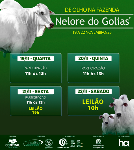 A Central Leilões realiza nesta quarta-feira, dia 19 e segue até o dia 22 de novembro às 11h pelo Canal do Boi, o Leilão Nelore do Golias, com oferta de bezerras, doadoras e pacotes de embriões.