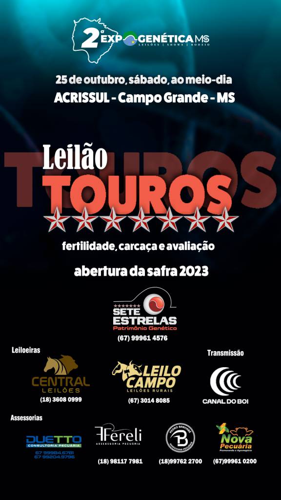 A Central Leilões e LeiloCampo realizaM neste sábado, dia 25 de outubro às 12h pelo Canal do Boi, o Leilão de Touros Sete Estrelas, com oferta de touros nelore com avaliação genética. O evento será realizado na Acrissul em Campo Grande/MS.