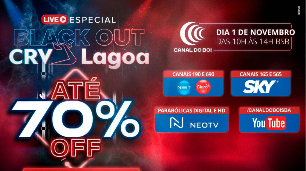 O Canal do Boi transmite neste sábado dia 1 de novembro às 10h, uma Live Especial Blackout CRV Lagoa até 70% off. A realização é da Central Bela Vista e CRV Lagoa. O evento será realizado em Botucatu/SP.