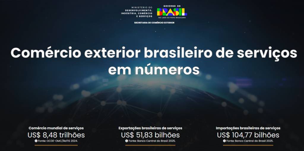 Entre os principais destaques da ferramenta, observa-se que as exportações brasileiras de serviços atingiram o valor recorde de US$ 51,8 bilhões em 2025, dos quais 65% correspondem a serviços entregues digitalmente, evidenciando o avanço da digitalização e o potencial competitivo do Brasil nesse segmento.