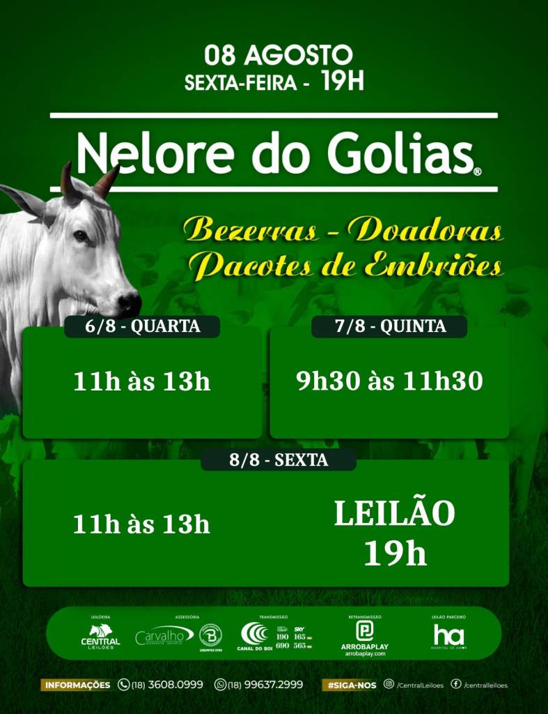 A Central Leilões começa nesta quarta-feira, dia 6 de agosto, em horários alternativos pelo Canal do Boi, uma série de apresentações dos lotes de bezerras, doadoras e pacotes de sêmen que estarão em oferta no dia 8 às 19h, no Leilão Nelore do Golias. Oportunidade para conhecer o trabalho de mais de 20 anos de Fabio e Lilica Almeida, no melhoramento genético da raça nelore.