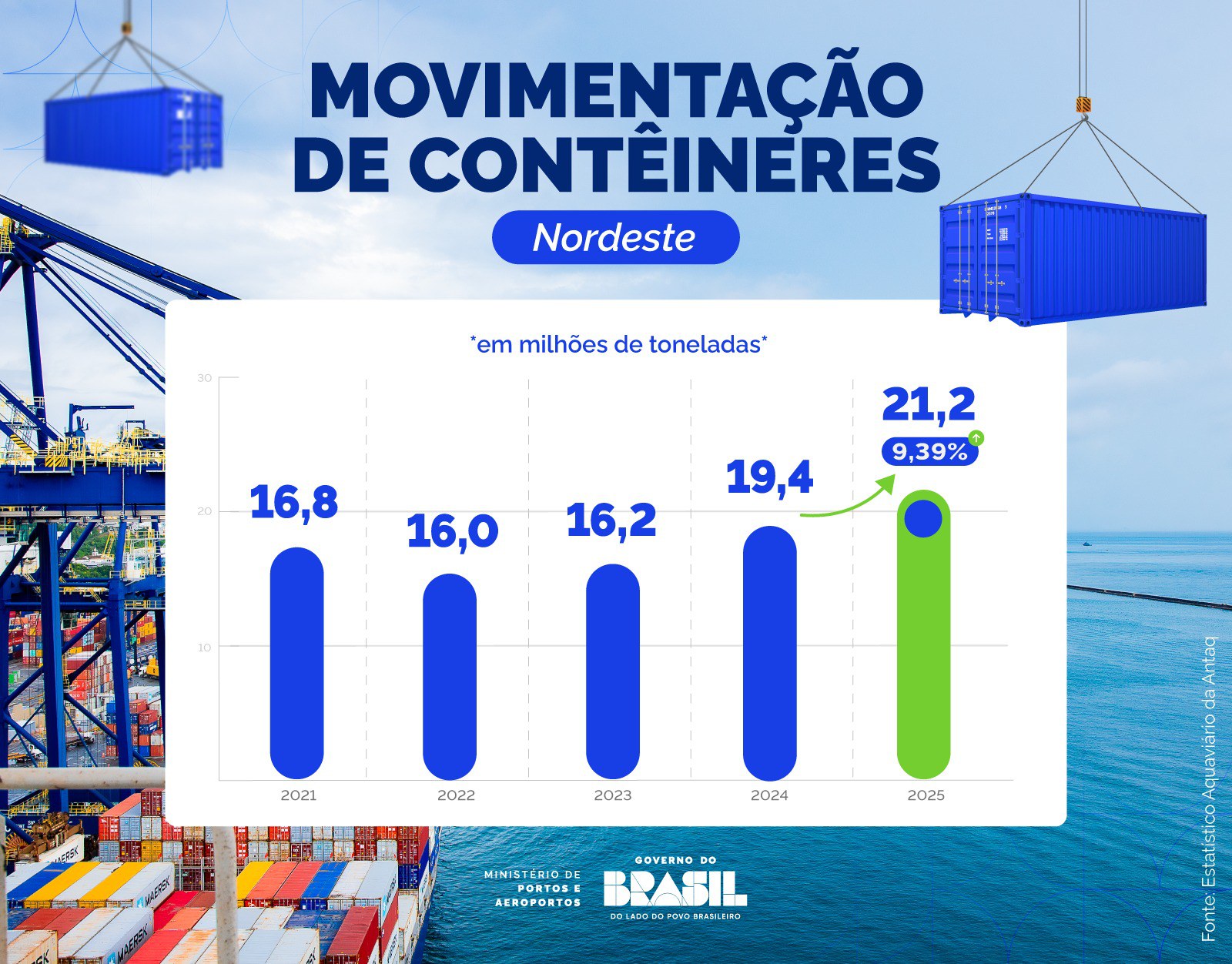 Um dos indicadores mais expressivos do aperfeiçoamento logístico do setor aquaviário nordestino foi a operação de contêineres, que alcançou um crescimento bastante significativo em 2025: com alta de 9,4%. Os 21,2 milhões de toneladas de contêineres concentram o maior volume registrado desde 2021.