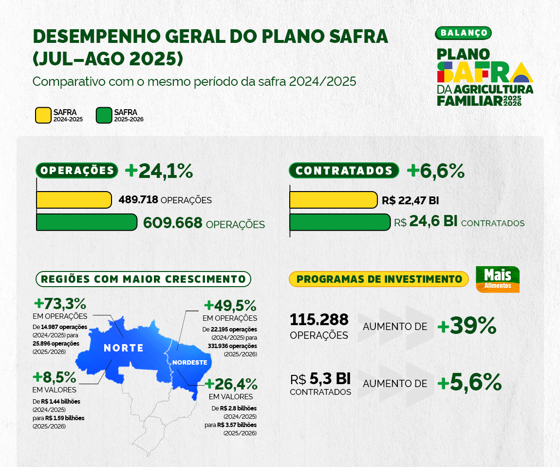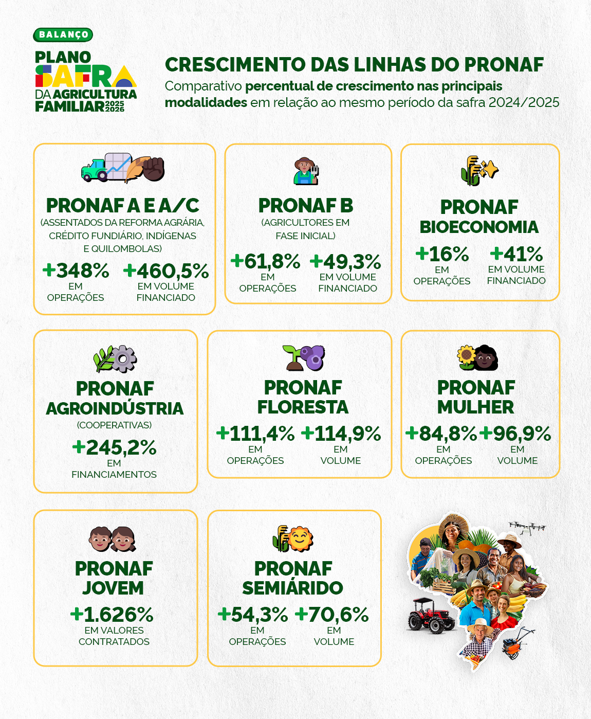 Programa Nacional de Fortalecimento da Agricultura Familiar (Pronaf) foi o grande destaque. O Pronaf A e A/C, voltado a assentados da reforma agrária, beneficiários do crédito fundiário, povos indígenas e comunidades quilombolas, registrou crescimento de 348% no número de operações e 460,5% no volume contratado. O Pronaf B, destinado a agricultores em fase inicial de estruturação, cresceu 61,8% em operações e 49,3% em recursos.