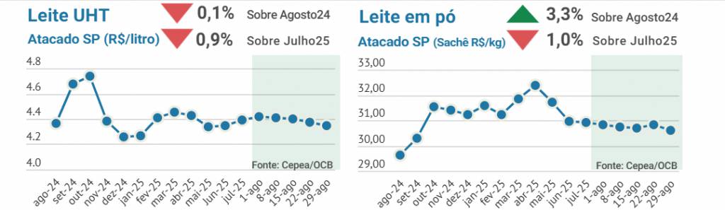 Os preços dos principais derivados lácteos mantiveram viés baixista. O queijo muçarela registrou queda mais acentuada, devido ao aumento da oferta e maior pressão de vendas. O mercado de leite UHT também apresentou um movimento de ligeira desaceleração nos preços. O leite em pó seguiu o mesmo caminho e sofrendo a concorrência das importações. No leite Spot, as cotações arrefeceram ao longo das últimas quinzenas, com maior volume de leite sendo ofertado e menor interesse dos compradores. Estoques com ligeiro aumento, forte competição entre laticínios e os varejistas buscando recuperação de margens tem mantido o mercado de lácteos mais baixista.