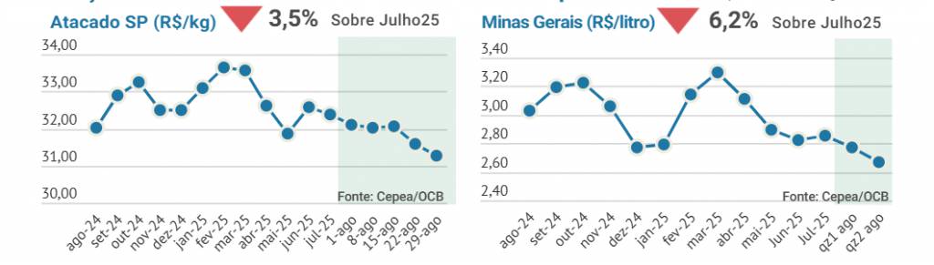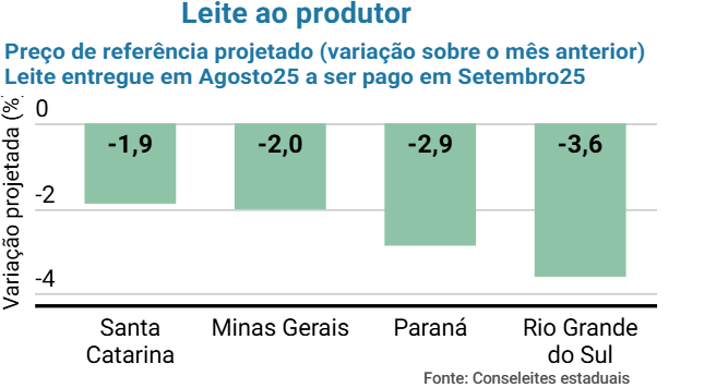 As sinalizações dos Conseleites para o pagamento do leite entregue em agosto apontaram queda nas projeções em todos os estados acompanhados. Paraná e Rio Grande do Sul registraram reduções mais acentuadas, enquanto Santa Catarina e Minas Gerais apresentaram recuos moderados. Mas o movimento geral foi de baixa, em linha com os preços no mercado atacadista de derivados.