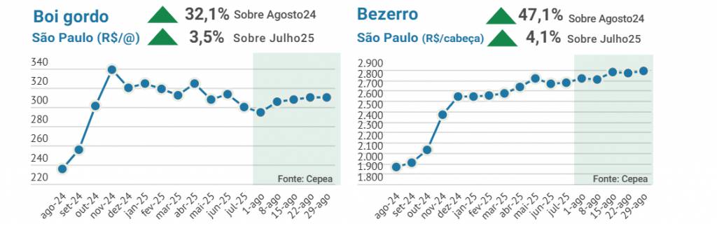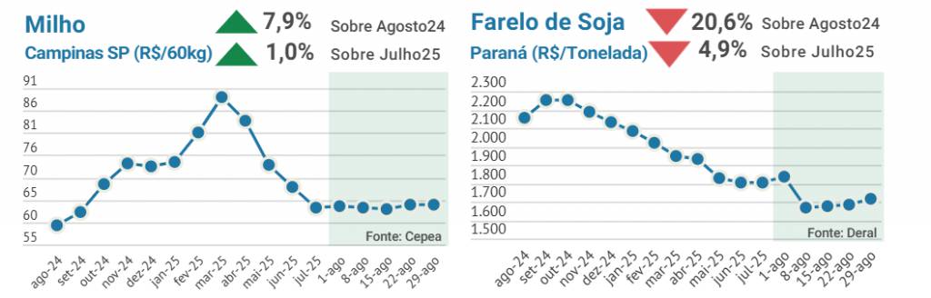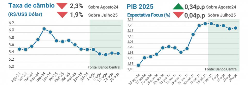 Os preços no mercado de milho ficaram relativamente estáveis no último mês, com a colheita da safrinha na fase final, mas com uma ótima produção. No mercado de soja, as cotações do farelo voltaram a recuar, com dois fatores desfavoráveis às exportações brasileiras: 1) expectativas de avanço no acordo entre Estados Unidos e China; 2) valorização do real frente ao dólar. No mercado pecuário, o boi gordo registrou pequeno aumento nos preços e puxou as cotações do bezerro, em um cenário de escalas curtas de abate e oferta mais ajustada de animais terminados, que se concentra em confinamentos neste período de estiagem. O câmbio oscilou com viés de apreciação e o Focus manteve a sinalização de crescimento do PIB em torno de 2,2% para 2025.