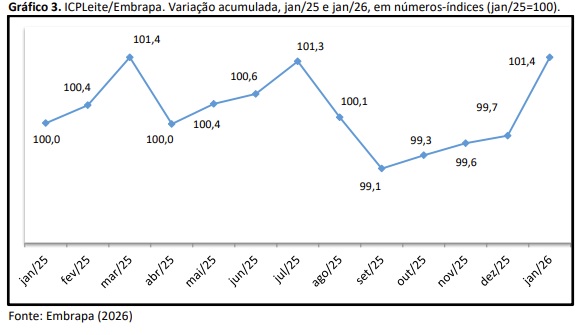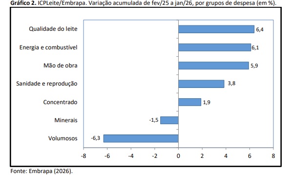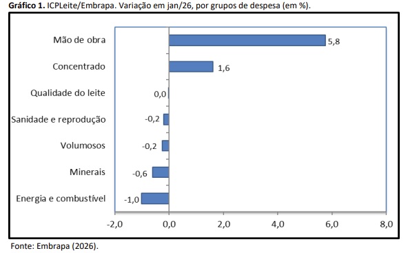 A alta do custo de produção de leite do mês de janeiro foi resultante, principalmente, pela elevação do valor do salário mínimo, o que contribuiu para que o custo da Mão de obra crescesse em 5,8%. Este fenômeno ocorre todo ano, neste mês, em função do reajuste por força de lei. Também o grupo Concentrado cresceu 1,6%, uma alta expressiva para apenas um mês. Os insumos deste grupo que tiveram maior variação foram fubá de milho (14,9%) e polpa cítrica (10,9%).
