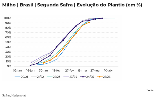Em relação ao plantio da segunda safra, até o dia 20 de março, 91,3% da área de milho estava plantada no Brasil, em linha com a média histórica de 91,6% para o período, embora abaixo dos 95% registrados no mesmo momento do ano anterior.