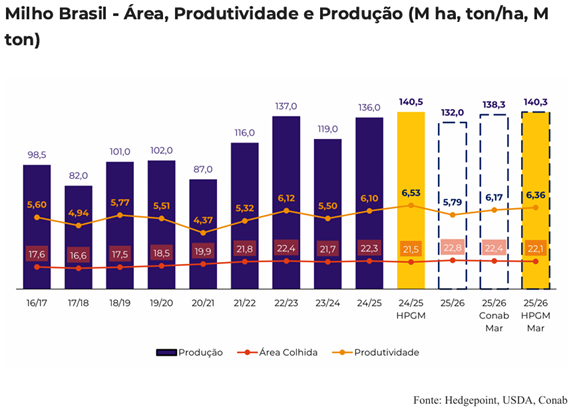 São Paulo, 25 de março de 2026 – A safra brasileira de milho 2025/26 é projetada em 140,3 milhões de toneladas, segundo estimativa da Hedgepoint Global Markets, o que representa uma leve queda de 0,1% em relação à temporada anterior, quando a produção foi estimada em 140,5 milhões de toneladas.