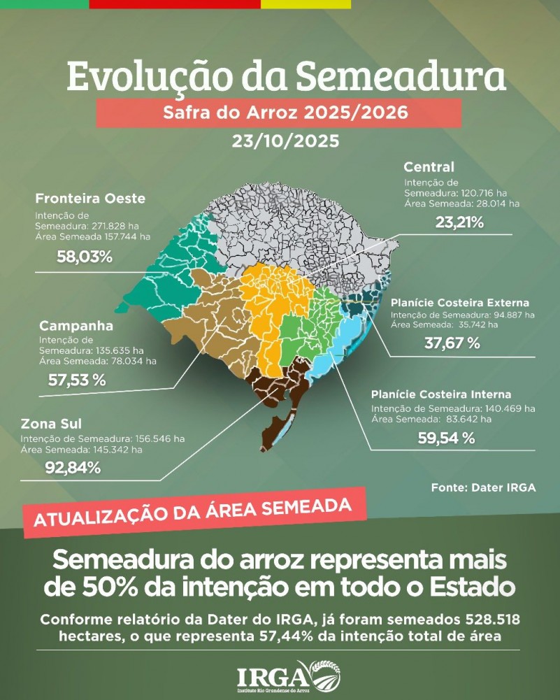 O Instituto Rio Grandense do Arroz (Irga) segue monitorando os dados de semeadura de arroz em todo o Estado do Rio Grande do Sul. Conforme relatório da Divisão de Assistência Técnica e Extensão Rural (Dater), já foram semeados 528.518 hectares, o que representa 57,44% da intenção total de área.