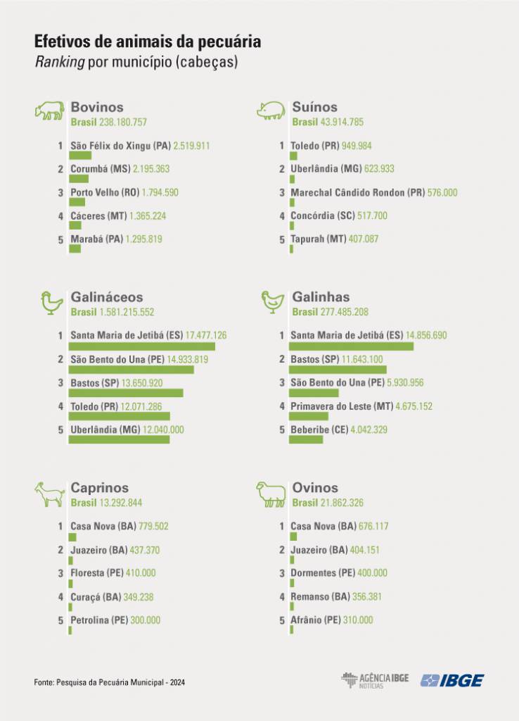 Entre os municípios, São Félix do Xingu (Pará), segue na liderança entre os bovinos, com um rebanho estimado em 2,5 milhões de cabeças, o que representa 1,1% do total brasileiro. Na sequência, aparecem Corumbá (Mato Grosso do Sul), Porto Velho (Rondônia), Cáceres (Mato Grosso) e Marabá (Pará). Somados, esses cinco municípios respondem por 3,9% do rebanho bovino nacional, totalizando 9,2 milhões de animais.