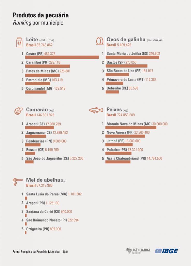 A Pesquisa da Pecuária Municipal 2024, divulgada hoje (18) pelo IBGE, trouxe essas e outras informações sobre os efetivos, produtos de origem animal e a aquicultura no país, que também estão disponíveis na página da pesquisa no Portal do IBGE e no Sidra.