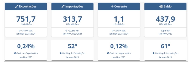 Em 2025, de janeiro a novembro, a exportação brasileira para a Venezuela somou US$ 751,7 milhões. O país foi o 52º maior destino das exportações brasileiras, com participação de 0,24% nas vendas nacionais, divulgou nesta terça-feira (6/1), o Ministério do Desenvolvimento, Indústria, Comércio e Serviços. No mesmo período, o Brasil importou US$ 313,7 milhões, e a Venezuela foi o 61º maior fornecedor, com participação de 0,12% nas compras nacionais.