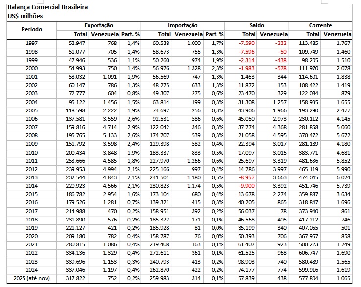 Além disso, a participação da Venezuela no total do comércio exterior brasileiro permaneceu modesta na maior parte do período, raramente superando 0,4% desde 2021, o que indica que, apesar da relevância histórica, o peso relativo da Venezuela diminuiu ao longo do tempo.